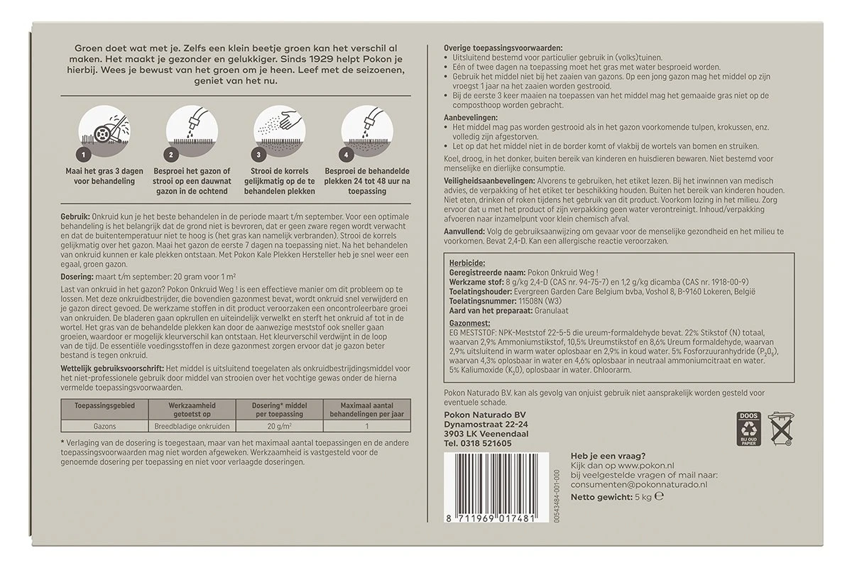 Last van onkruid in je gazon? Pokon Onkruid Weg! is een effectieve manier om dit probleem op te lossen. Met deze onkruidbestrijder, die bovendien gazonmest bevat, wordt onkruid snel verwijderd en je gazon direct gevoed. De werkzame stoffen in dit product veroorzaken een oncontroleerbare groei van onkruiden. De bladeren gaan opkrullen en uiteindelijk verwelkt en sterft het onkruid af tot in de wortel. Het gras van de behandelde plekken kan door de aanwezige meststof ook sneller gaan groeien, waardoor er mogelijk kleurverschil kan ontstaan. Het kleurverschil verdwijnt in de loop van tijd. De essentiële voedingsstoffen in deze gazonmest zorgen ervoor dat je gazon beter bestand is tegen onkruid. Onkruid kun je het beste behandelen in de periode maart t/m september. Voor een optimale behandeling is het belangrijk dat de grond niet is bevroren, dat er geen zware regen wordt verwacht en dat de buitentemperatuur niet te hoog is (het gras kan verbranden). Maai het gazon de eerste 4 dagen na toepassing niet.